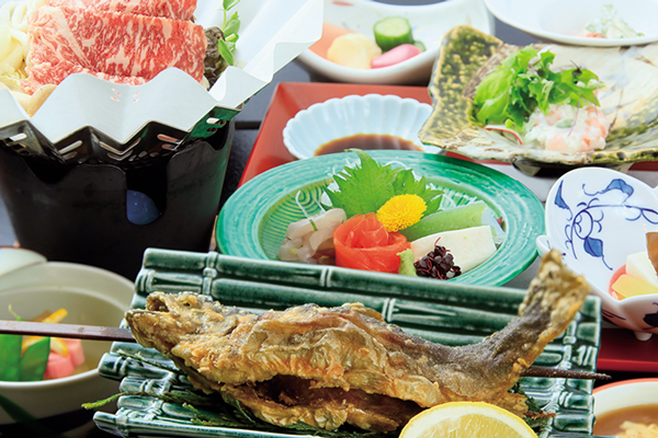 食膳は、旬を最大限に生かした調理で用意。夕食はギンヒカリ(ニジマス)の刺身や上州牛、朝食は焼き立てのお魚にお手製豆腐など約4品の提供に加え、小鉢約12種類をバイキング形式で自由に選べる。