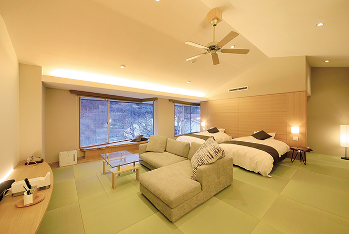 自然林の雄大さを望む客室は落ち着いたしつらえで、眺望も重視した配置。四季折々の眺めにいつ訪れても満足させられ、天気が良ければ谷川岳の景色も楽しめる。