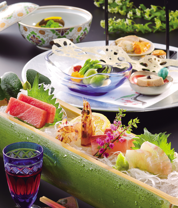食事は地元群馬を中心とした旬の食材を厳選。奇をてらわない食材本来の味を、伝統的な調理方法と現代の料理でコラボレーション。ブランドニジマスのギンヒカリやシルクサーモン、増田牛、上州麦豚などを採用している。