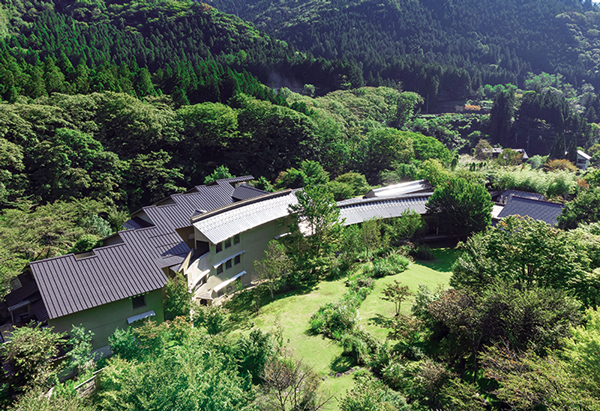 谷川岳を借景に、おだやかな渓流のほとりに建つ「別邸 仙寿庵」。雄大な自然に抱かれた建物は、現代建築と伝統技術が融合し、上品で高級感あふれるたたずまいとなっている。