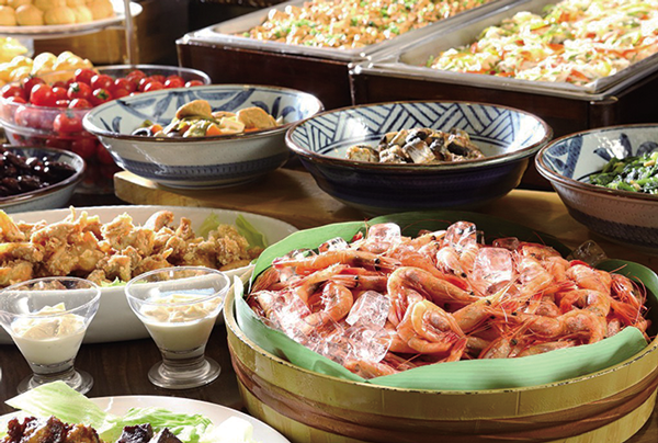 料理は、夕食・朝食共にバイキング。安全な食材と調味料にもこだわったオリジナル料理で、夕食には和洋中の40品ものメニューが並ぶ。夕食後は、本館2階のロビーで開催される無料ライブも大好評だ。