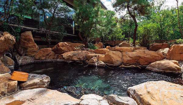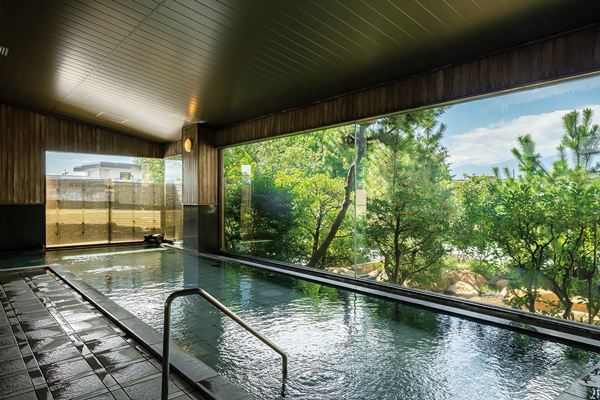 開湯1200年の歴史を持つ温泉は、黒い御影石を使用した重厚な雰囲気の大浴場や庭園を愛でる露天風呂などが揃う。客室露天風呂は源泉掛け流し。身も心もつるつるに癒されるだろう。