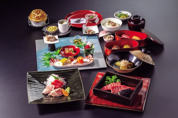 夕食は、上質な霜降りが特徴の「甲州牛」や水揚げしてすぐに空輸した「日本近海産生本マグロ」等をメインに、山梨の食材と旬の味覚を器の中に表現した、料理長こだわりの会席料理をゆっくりと五感で味わいたい。