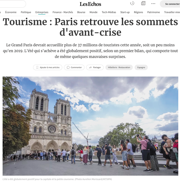 8月末発表の速報によると、この夏のパリの観光客は数の上では昨年とほぼかわらずだが、年間予想だと、今年のパリ市の観光客は3700万人以上で、ほぼコロナ禍以前の水準に戻るという。◆パリで急増しているのは、前年比24%増のサウジアラビアなどの中東の富裕層だという。◆中国人旅行客も、まだコロナ禍前ほどではないものの、前年比4割増、日本人旅行客も34%増だったという。◆この夏のパリにはいくつも新しいスポットもできていた。◆復興したノートルダム大聖堂や、昨年のオリンピックで設置されていた気球型聖火台のほか、観光客にはあまり関係ないかも知れないが、セーヌ川での遊泳解禁、自転車ロードレース「ツールドフランス」の最終日コースにモンマルトルの丘が設定されたなど。◆この流れで宿泊業はかなり好調だが、そうでもない業種もある。◆物価高だけではなく、民泊のようなキッチン付きの宿泊形態が増えていることもあり、外食産業は逆に売上は減少傾向だという。◆しかし、フランスの外食産業も進化しており盛り返しが期待される。