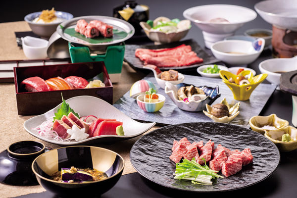 山梨県の最高級ブランド「甲州牛」を贅沢に堪能できる自慢の料理は、常磐名物「溶岩焼き」のほか、甲州牛の握り・せいろ蒸し・しゃぶしゃぶ(またはすきやき)がすべて楽しめる「プレミアム甲州牛会席」が人気。朝食も山梨名物「ほうとう鍋」のほか、甲州牛の牛丼も味わえるという、まさに肉好きにはたまらない内容。また、ロビーではアイスの無料サービスや「あずきほうとう」、稲荷寿司なども毎晩ふるまわれている。