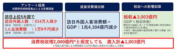 免税制度廃止による経済影響については、ジャパンショッピングツーリズム協会など小売業関連7団体が7月に、訪日意欲が高い海外在住の外国人を対象にアンケートを実施。この調査では、免税制度の廃止で訪日外国人旅行者による消費額は1兆4304億円減少すると算出された。これに伴う税収の減少額は3003億円となり、仮に制度廃止によって2000億円の消費税収増があったとしても、歳入全体では1003億円の減少となり、歳入にはマイナスの影響があると試算した。