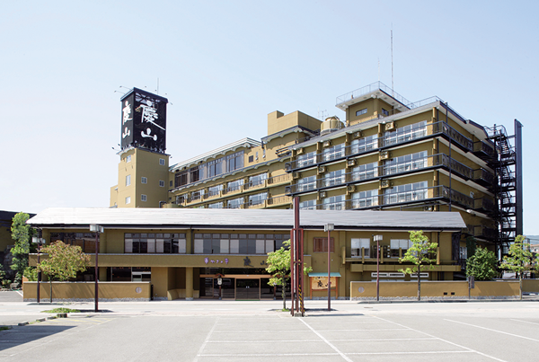 駅から徒歩5分の好立地に建つ「華やぎの章 慶山」は、湯量豊富な大自噴温泉が自慢の宿だ。大浴場のほかに檜、岩の2つの露天風呂で楽しめる湯は柔らかな感触が特徴で、肌がつるつるになると大人気だ。