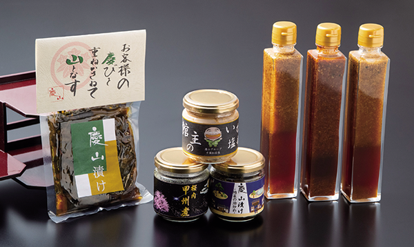 お客様の“美味しい”をお土産にした慶山オリジナル商品。人気の「慶山漬け」や「鶏そぼろ」、ドレッシングなど、すべて手作りの逸品。「慶山」の本格的な味を家庭でも気軽に堪能できる。売店で購入、商品の発送も行っている。