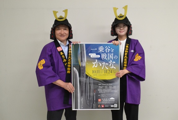 福井県立一乗谷朝倉氏遺跡博物館の湯川直館長と田島美玖主事がこのほど来阪し、10月11日から11月24日まで実施する秋季特別展「一乗谷と戦国のかたな」をPRした。同博物館としては初の「刀剣」をテーマにした特別展となる。