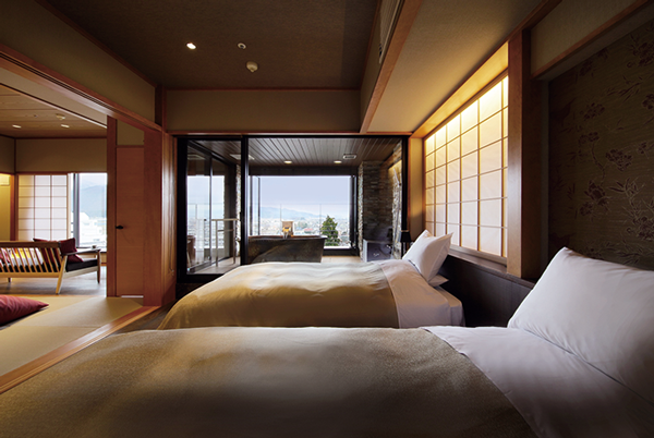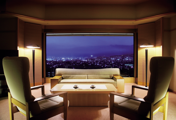 部屋の大きな窓からは雄大な北アルプスが望め、静かで落ち着けるたたずまい。夜には松本城下の美しい夜景が広がる。