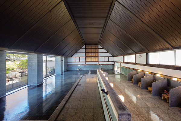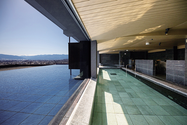 浴槽前に巨大な水鏡を配し、夕暮れ時には目の前の山並みが水面に映る絶景のロケーションが自慢の展望風呂「美しの湯」、ジャグジーを兼ね備えた県内随一の広さを誇る庭園大浴場「束間の湯」、趣の異なる3種類の貸切風呂など、バリエーション豊かに揃う。