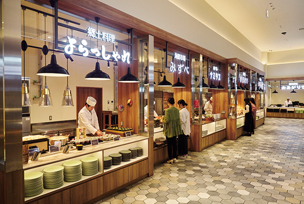 夕食ビュッフェは「RESORT FOOD HALL 湖畔の風」。13の個店やコーナーに料理が並び、信州の食材や郷土料理など地産の味も堪能できる。