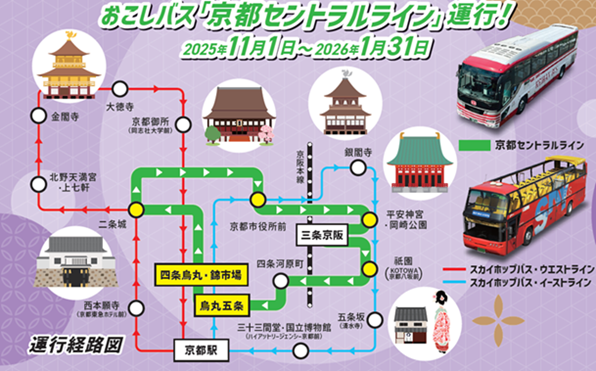 路線名称は「おこしバス『京都セントラルライン』」で、運行期間は2025年11月1日(土)~26年1月31日(土)までの計92日間。運賃は1乗車あたり、大人500円、子供250円。京都市交通局「地下鉄・バス1日券」とスカイホップバスKYOTO「当日券」「2日券」でも乗車できる。