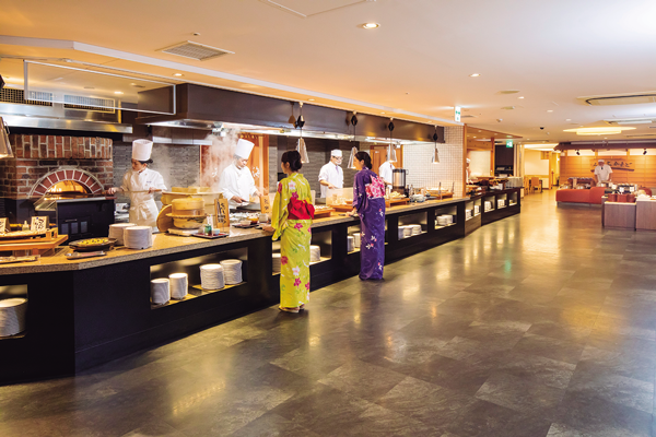 夕食は3つの料理スタイルから選ぶことができる。しんわダイニング「天・地・海」にはライブキッチンを備え、毎晩、地魚解体ショーが行われるほか、新鮮なお造り寿司をはじめ、石窯ピザや牛肉鉄板焼きなどの出来立て料理が食べ放題で楽しめる。