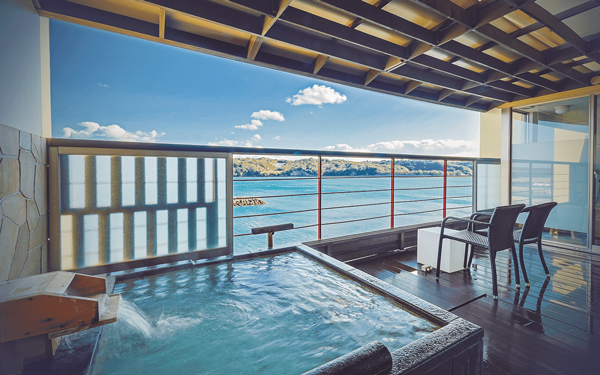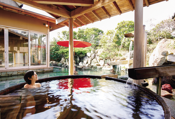宿オススメの過ごし方は、まず自慢のお風呂。豊富な湯量に感動するバラエティ豊かな庭園露天風呂のほか、展望露天風呂や貸切風呂、足湯などがある。自家源泉の療養泉は飲用もでき、胃腸を活性化させる効果がと言われている。