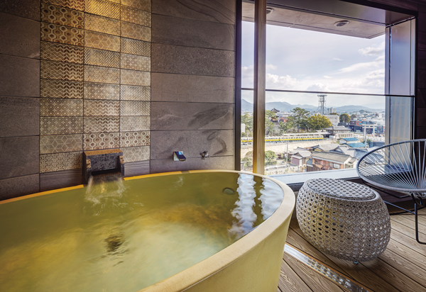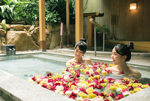 今なお江戸情緒が香る風情あふれる金刀比羅宮の門前町、琴平に建つ和風旅館。温泉は、敷地内に湧く源泉「湯元こんぴら温泉華の湯」と琴平町の智光院温泉、2種を堪能できる。大浴場と露天風呂では、15種類の湯めぐりを。なかでも、バラの花を浮かべた女性用露天風呂「はな露天」は好評だ。