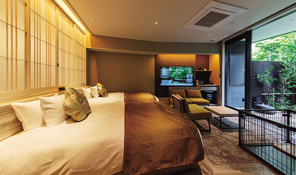 客室は、2023年3月にオープンした和モダンの温泉露天風呂付和洋室「リビングスイート君子香」と「君子香ユニバーサルルーム」が人気。