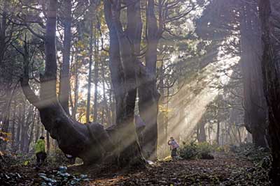 「ブナと巨木のもがみ回廊」をキャッチコピーとする最上地域。最大の特徴は、手軽なアクセスで太古の神秘に出会えることだ。戸沢村の幻想の森もその1つ。駐車場(マイクロバス)のすぐ前に、樹齢1千年以上の天然杉が生い茂る。幹の途中から枝分かれした形が特徴で、周囲の植林された杉との違いは一目瞭然だ。「最大は幹回り17㍍」「写真を撮るなら朝日がさす午前中がおすすめ」。ガイド(最上峡案内人協会)の案内も興味深い。大型バスの場合、川の駅・最上峡くさなぎの駐車場で、マイクロバス(1台手配し、2往復輸送)に乗り変える。