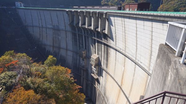 続いて、参加者は伏見課長の案内で川治ダムも見学。同ダムは洪水調節、河川の正常な流れの維持、農業、上水道、工業用水の確保のために建てられたアーチ式で、ダムの両側の岩盤で水圧を支えている。重力式と比べて少ないコンクリートで建設することができ、ダムの厚さは薄くなる。このため、重力式ダムなどはダム本体の内部に点検用通路が設けられているなか、川治ダムは外部に張り出す形で地面から30㍍、60㍍、90㍍の高さに、管理用通路「キャットウォーク」が設置されている。