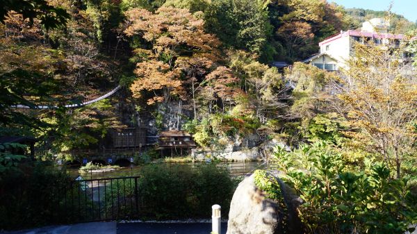 その後、見学した両ダムの下流域を流れる各河川が合流する場所にある川治温泉を、日光市観光協会の案内で散策。温泉街の中心を流れる男鹿川沿いには、足湯や川を泳ぐ魚を見ることができる遊歩道が整備されている。また、2つの川が合わさることから、出会いや縁結びの願いを込め、各河川の石を抱き合わせた道祖神を設置している。