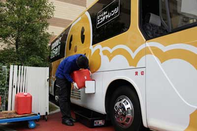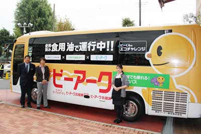 “ピーくんバス”は同社の「ピーくんガーデン」(東京都足立区)と、亀有駅・綾瀬駅をつなぐ無料巡回バス。東京ワーナー観光が運行を、ユーズが燃料の供給を担う。特徴は環境への配慮の厚さで、利用燃料はリサイクルされた天ぷら油だけという徹底ぶりだ。