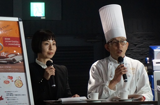 今回は2019年に誕生したブランド「ホテルタビノス」も参加。また、海外のホテルグレイスリーソウルとホテルグレイスリー台北も初めて加わる。フェア開催に先立ち、12月10日(水)に新宿ワシントンホテルで開かれた取材会で、藤田観光WHG事業部マーケティング室の二宮栄治料理担当部長は「これまでで最大の33ホテル全館で展開する」と発表。フェアオリジナルデザインを施したスープ専用のテイクアウト容器も作り、部屋に持ち帰ることができるようにするほか、レストランがない「ホテルタビノス」では、容器とオリジナル粉末スープを用意する。