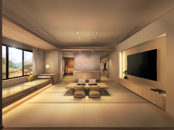 それぞれ和室10畳の客室2室を1室にするかたちでリニューアルし、同館最大の約60平方メートルの広さとなる。室内にサウナ(ドライサウナ)を設けるなど、セミスイートとして販売する。 新客室はシモンズ社製ワイドシングルベッド2台を備えるほか、最大4枚の布団を敷くことができ客室定員は6人。室内には85インチの大型スマートテレビを設置するほか、美容家電として高い人気を誇るレプロナイザーのドライヤー「27D Plus」やヘアアイロン、ヘアビューロンを導入する。シャワーヘッドにはRefa(リファ)の製品を取り入れ、上質な滞在を提供する。