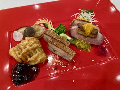 本紙を含む4人がそれぞれの料理を、見栄えや味、アイデアなど、5つの観点から審査した。中島氏は一つひとつがメインを張れる牛肉、豚肉、鴨肉を、少量であえて1皿にして出すことで、「多種多様の味が楽しめるのでは」というアイデアを形にした。牛頬肉はパイ包み焼きに、豚肉は触感が楽しめるクリスピーポークに、鴨肉はチップの代わりにジャスミン茶でスモークし、フォアグラを添えた。審査では「さまざまな調理法からまったく違う歯ごたえが感じられる」点などが評価された。