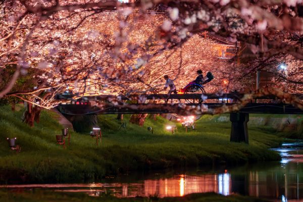 プログラムは旅館専用の人力車に乗り、ライトアップされた夜桜を約1時間かけて鑑賞するもの。界のスタッフが同行し、記念撮影をサポートするなど、非日常の花見体験を演出する。