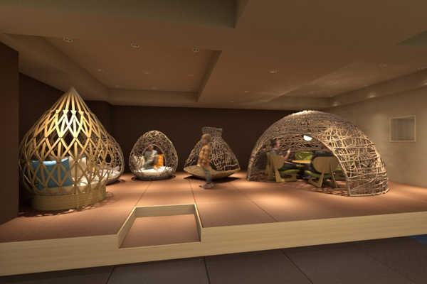 2階に新設するオールインクルーシブラウンジ「一福」は、アルコールを含む各種ドリンクやスナックを自由に楽しめるほか、複数人で囲めるテーブル席や大きな竹籠をモチーフにしたソファ空間などを設ける。