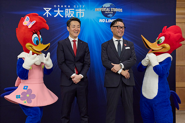 同日、市役所本庁舎で行われた包括連携協定締結式には合同会社ユー・エス・ジェイの村山卓社長と大阪市の横山英幸市長が出席。村山社長は「大阪の皆様に支えられてきた25年間。大阪市と力を合わせ、大阪を一層“超元気”にしていきたい」と述べ、横山市長も「USJは大阪を盛り上げてくれる存在。大阪の魅力発信において大きな一歩となる」と期待感を示した。