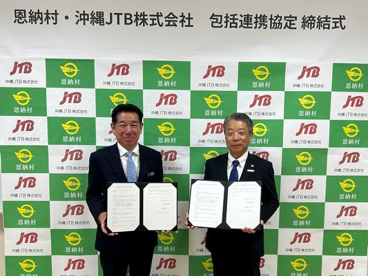 沖縄JTB(桂原耕一社長、沖縄県那覇市)は2月26日(木)、沖縄県・恩納村(長浜善巳村長)と持続可能な観光地域づくりの実現に向け、双方が有する人的・物的資源を有効に活用した包括連携協定を結んだ。今回の協定により、官民共創による持続可能な観光推進体制を構築し、恩納村の観光振興と地域活性化に取り組む。
