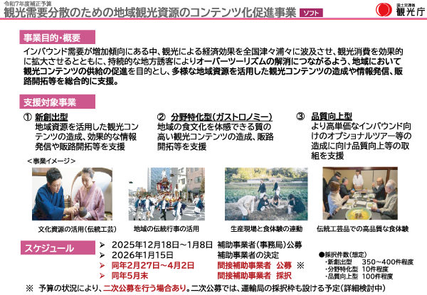 矢吹 「観光需要分散のための地域観光資源のコンテンツ化促進事業」は、地方誘客を進めるため、地域ならではの観光コンテンツの供給促進を目的としています。多様な地域資源を活用した観光コンテンツの造成や情報発信のほか、販路開拓が中心となる取り組みなどを総合的に支援する補助事業となります。