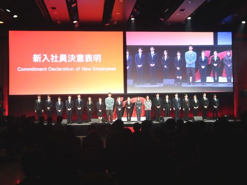 新入社員の決意表明では、グループ各社の代表者19人が登壇し、それぞれ想いを乗せた決意を熱く語った。JTBの米田隼輔さんは「デジタル社会が急速に発展している今だからこそ、五感を生かしたリアルな体験価値をつくりだせるように挑戦を重ねていく。交流創造事業では、人と世界の新たなつながりを生み出す」と力を込めた。