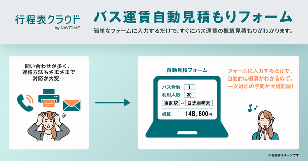 新機能では、出発地や目的地、降車場所、各到着希望時間などの概算見積もりに必要な内容を、利用者がフォームに沿って入力すると、画面上で即座に行程表と概算運賃が提示される。見積もり依頼内容の確認や概算見積もり算出の手間が省けるうえ、回答を待つ間の利用者離脱を防ぎ、円滑な成約へつなげる狙い。