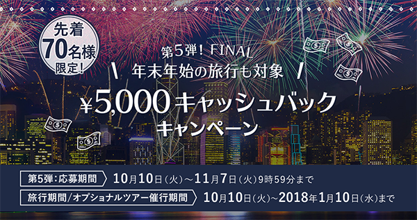 DeNAトラベル(大見周平社長、東京都新宿区)は10月10日(火)、オプショナルツアーの予約専門サイト「ベルトラ」とともに、5千円キャッシュバックキャンペーンを始めた。