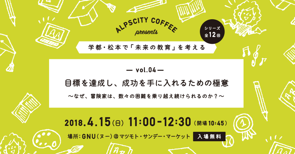 自転車世界一周で日本記録(157カ国、約16万㌔)を持つという小口氏。トークセッションでは、Edition4 Studies代表理事兼清泉女子大学教授の山本達也氏とともに、やり抜く力の身につけ方を考える。子供の「未来の教育」をテーマに、全12回の開催を予定する「学都・松本で未来の教育を考える」シリーズの一貫(第4回目)となる今回のトークイベント。参加費は無料で、食事やドリンクとともに楽しめる。