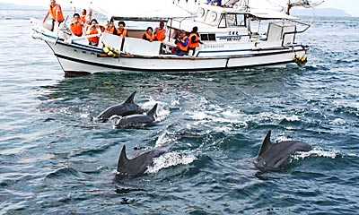 列車運行記念として同市では、天草産アワビや伊勢エビなど地元の海の幸を使った豪華なグルメプラン「A級グルメフェア」を各宿泊施設で来年3月31日まで提供する。一番の見どころは野生のミナミハンドウイルカに1年中98%以上の確立で出会えるイルカウォッチング。五和町沖に約200頭が生息し、専門ガイドの解説付きプランもある。