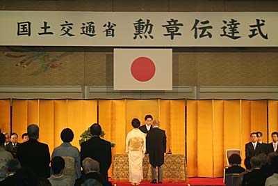 国土交通省の勲章伝達式は11月7日、東京都港区の東京プリンスホテルで開かれ、国土交通省の羽田雄一郎大臣は、「これまで我が国の発展に貢献されている。皆さまの輝かしいご功績にお祝いを申し上げたい」と述べた。