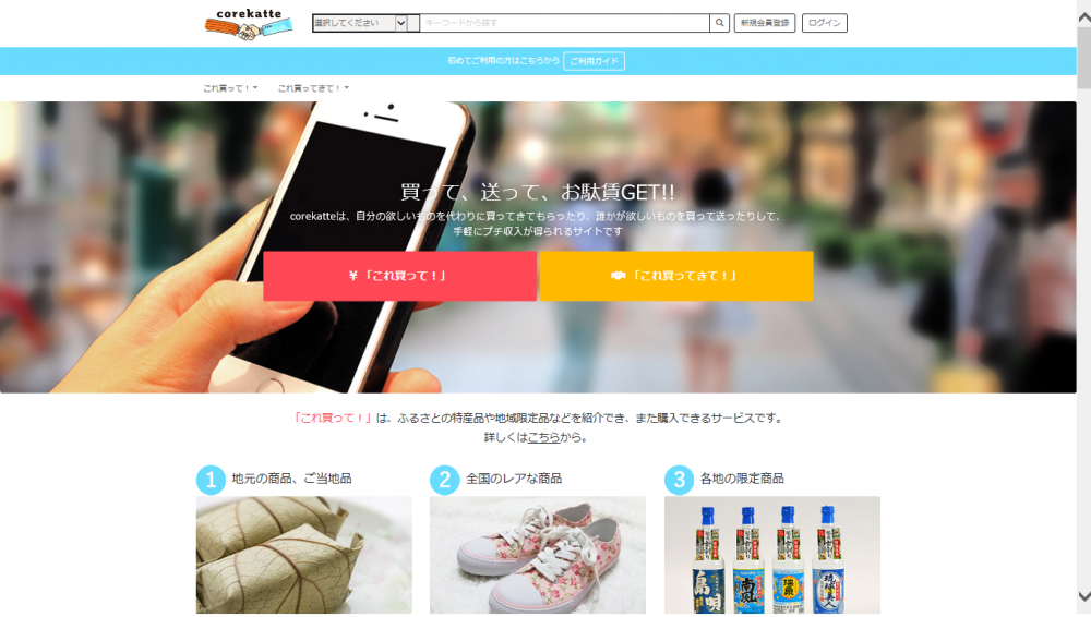 旅行のついでにお使いをして、お駄賃をゲット!――。コレカッテCompany(楠本義明社長、東京都品川区)は10月1日(月)、商品売買のマッチングサイト「corekatte(コレカッテ)」をオープンした。同サイトは、自分の周辺で購入できる希少価値の高い商品などを紹介して買いたい人を募ったり、自分が欲しい商品を買ってきてくれる人を探すことができるサービス。発送する側は、購入代金に加え購入者から「お駄賃1千円」が支払われる仕組みだ。