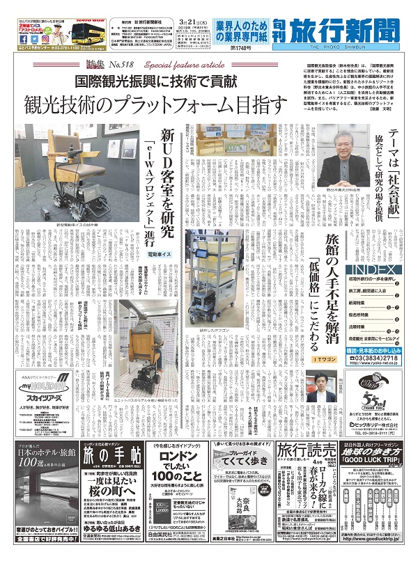 国際観光施設協会(鈴木裕会長)は、「国際観光振興に技術で貢献する」ことを理念に活動している。最新技術を生かし、生産性向上など観光業界の課題解決に向けた提案を積極的に行う。新設されたホテル&リゾート分科会(野出木貴夫分科会長)は、中小旅館の人手不足を解消するためにAI(人工知能)を活用した自動搬送機を試作。また、バリアフリー客室を充足させるため、新型電動車イスを考案するなど、観光技術のプラットフォームを目指している。