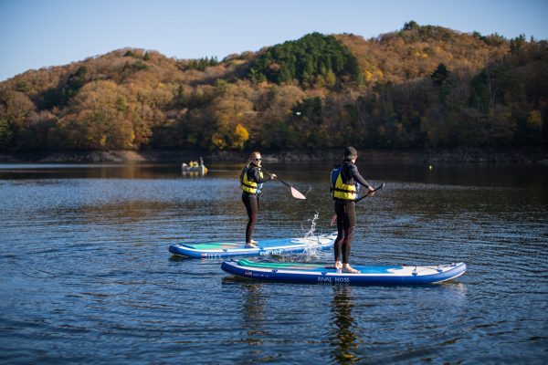 今話題のSUP!大きめのボードなので初心者でも簡単なレクチャーを受ければすぐに乗れるようになる。ウエットスーツもセットで安心。散歩気分で湖面から三河湖周辺の絶景が満喫できる。