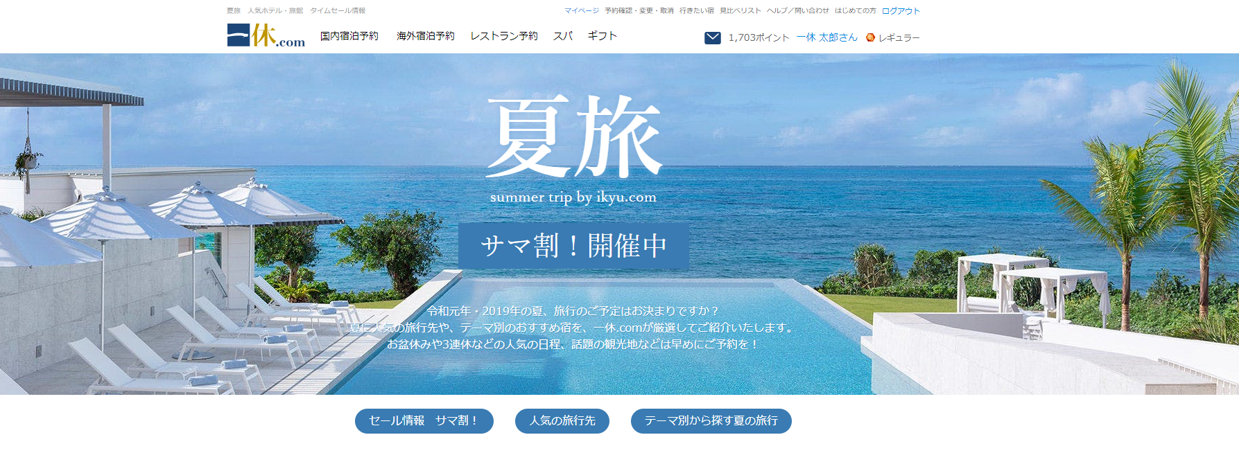 高級ホテル・旅館の予約サイト「一休.com」を運営する一休(榊淳社長)は、夏旅を応援するキャンペーン「サマ割!2019」を、2019年5月31日(金)~8月8日(木)正午までの約2カ月間実施する。