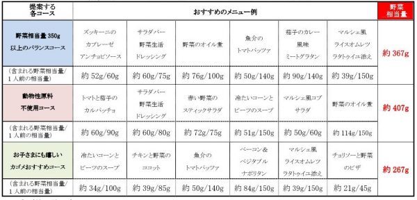 同イベントは、厚生労働省推進・健康日本21 が推奨する成人の1 日当たりの野菜の平均摂取量の目標値350㌘相当を楽しく食べてもらおうと昨年初めて開催された。肉や魚料理も組み合わせた「野菜相当量350㌘ 以上のバランスコース」と、より野菜をおいしく楽しく食すことにこだわった「動物性原料不使用コース」、野菜が苦手な子供も楽しめる「お子さまにも嬉しいカゴメおすすコース」の3つを提案する。