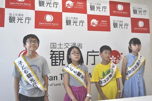 「よろしくおねがいします」――。国土交通省15階にある観光庁のフロアの一角に、「子ども観光庁長官」たちの元気な声が響いた。同庁は8月7―8日の「子ども霞が関見学デー」に合わせ、恒例の「あつまれ! 子ども観光庁長官」プログラムを行っている。7日には全国から小学校4~6年生の4人の子どもが参加し、長官業務などを体験。記者会見にも挑戦し、eスポーツイベントを活用するなど訪日誘客の施策を披露した。