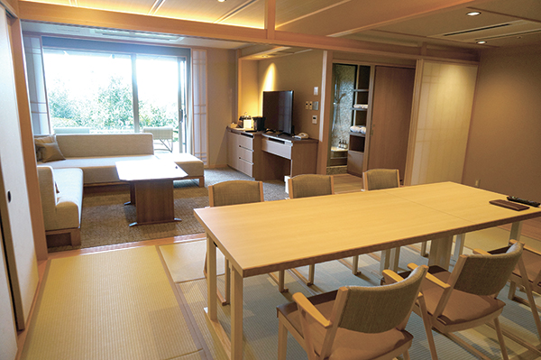 7階にある貴賓室(1室)は同ホテル最上級のスイートルームの位置付け。184・7平方㍍の空間に銀泉露天風呂、温水プール、2ベッドルームのほか、料理人の出張料理に対応するキッチンも備える。宿泊料金は2人1室で1人10万円(平日、1泊2食付き)。