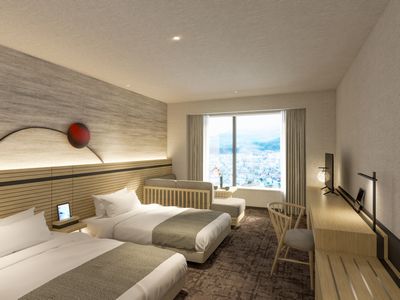 客室は、日本人観光客などをメインターゲットに、増加する訪日外国人観光客も含めた幅広いニーズに応えるため、全室禁煙でツインルーム主体のダブルルームや和洋室など、全7タイプ101室。1室当たりの広さは33~80平方㍍、窓からの景色が堪能できる、ゆったりとしたレイアウトや飛騨高山の自然や伝統工芸をイメージした落ち着いた内装デザインとなっている。このほか、全室バスとトイレが分離し、快適に過ごすことができる。