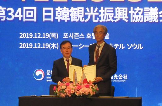 第34回日韓観光振興協議会が2019年12月19日(木)、韓国・ソウル市内のホテルで開かれ、両国間の意見交換や確認文書への署名を行った。日韓観光交流を取り巻くさまざまな状況にかかわらず、観光交流を継続する必要があるとの認識を共有し、両国の相互交流を拡大するための多様な協力課題について意見を交わした。