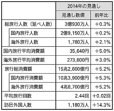 JTBがこのほど発表した2014年の旅行動向見通しによると、1泊以上の国内旅行人数は前年比0・2%増の2億9150万人、海外旅行人数は同2・1%増の1780万人。また、訪日外国人数は同14・3%増の1180万人と、2013年に続いて国内、海外、訪日ともに13年を上回ると予測。とくに訪日外国人数は大幅に増加するとみる。