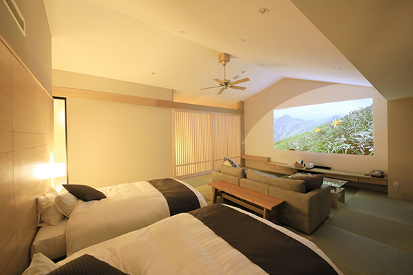 同じく「キングベッド」は、10畳の和室を一新し、シモンズ製のキングベッドを設置。こちらもテレビはプロジェクターで壁に映し、大画面で映像が楽しめる。